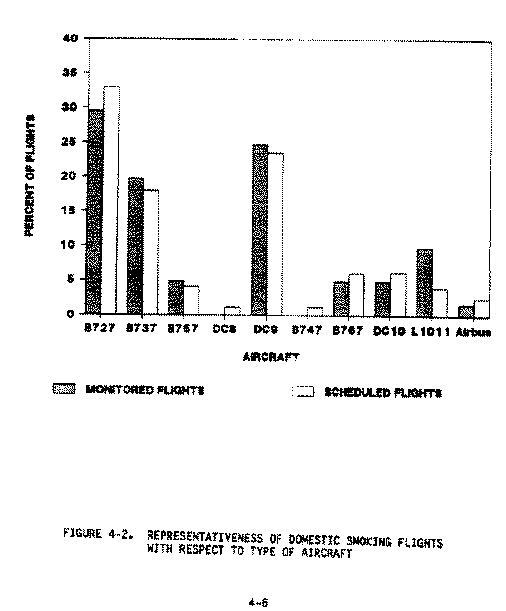 The Representativeness of monitored flights is shown more directly in Figure 4-1, in relation to all flights (more than 100,000) that were scheduled for departure from major U.S. airports during January 1989. The comparison is restricted to domestic smoking flights, the largest subset of flights (61) that was monitored. As indicated by the comparative percentage frequency distributions in the figure, the monitored flights were proportionately representative of most airlines. The five airlines (American, Continental, Delta, Trans World, and United) that accounted for a majority of the scheduled flights were also associated with a majority of the flights that were monitored, and these five airlines were represented in nearly the same order by relative percentage. The most notable discrepancy between monitored and scheduled flights was the lack of representation of Eastern Airlines (EA); Eastern flights were deliberately avoided during the monitoring period (early April to early June 1989) because of Eastern's curtailment of services, and associated uncertainty in flight availability, at that time.