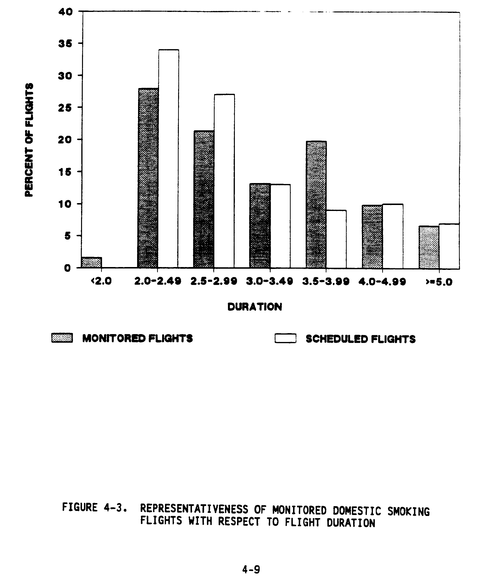 The distribution by flight duration is summarized for the three subgroups of monitored flights in Table 4-4. All international flights were greater than five hours in duration, averaging 8.9 hours. Domestic smoking flights, averaging 3.2 hours in duration, also included some that were greater than five hours long, but half were less than three hours long. One of the smoking flights was slightly less than two hours in duration, due to variability from the nominal scheduled flight duration that was slightly above two hours in this case. Most of the nonsmoking flights, averaging 1.6 hours in duration, were less than two hours; the exceptions were associated with two carriers--Northwest Airlines (all flights arriving and departing within the continental United States are nonsmoking) and United Airlines (all flights of 1,000 miles or less in distance are nonsmoking). The distribution of monitored domestic smoking flights by duration closely resembled that of scheduled flights (Figure 4-3), with the exception that flight durations between two and three hours were somewhat underrepresented and durations between 3.5 and tour hours were over-represented.